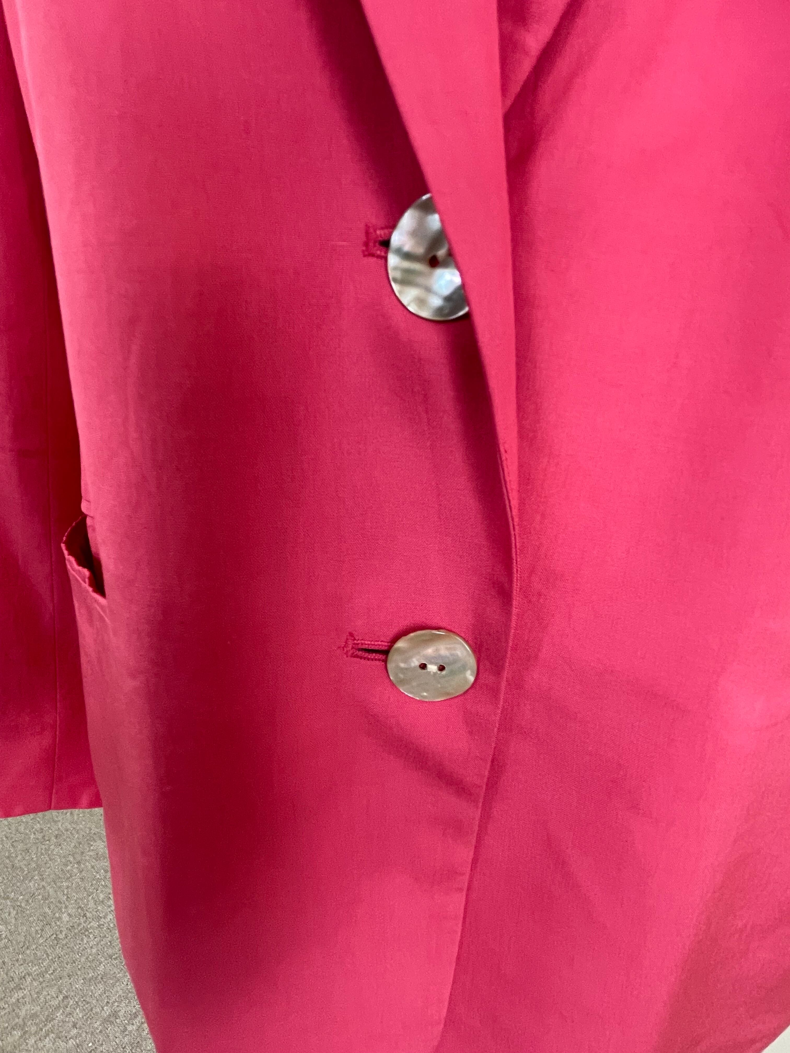 袖とフロントのボタンがシェルボタンになっていて陽の光できれいに光ってオシャレなボタンになっています。