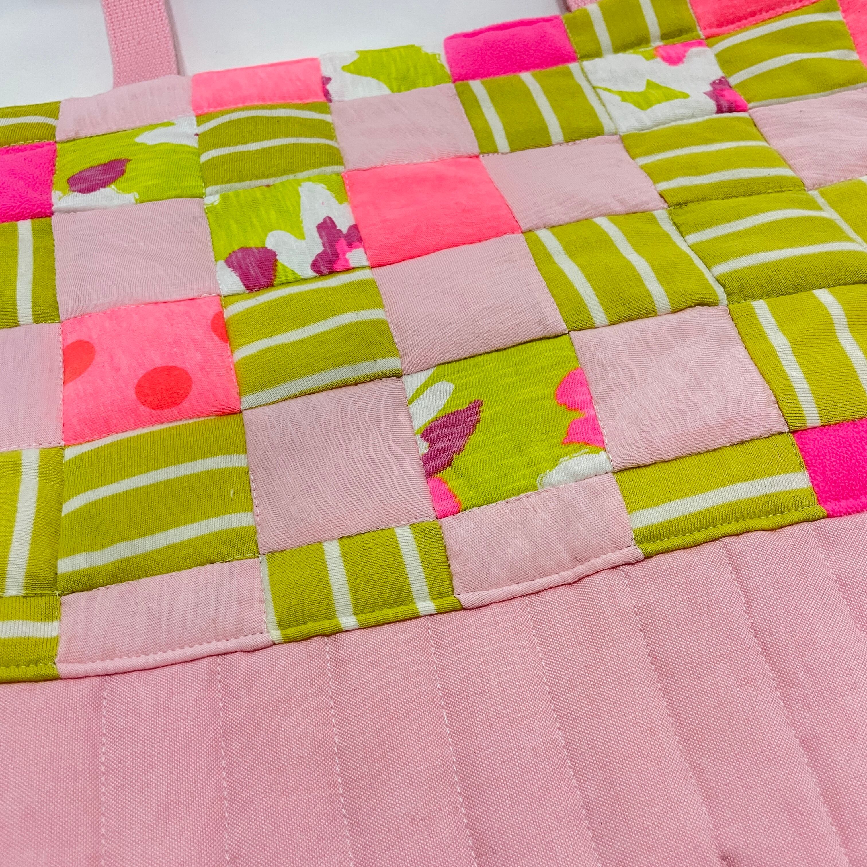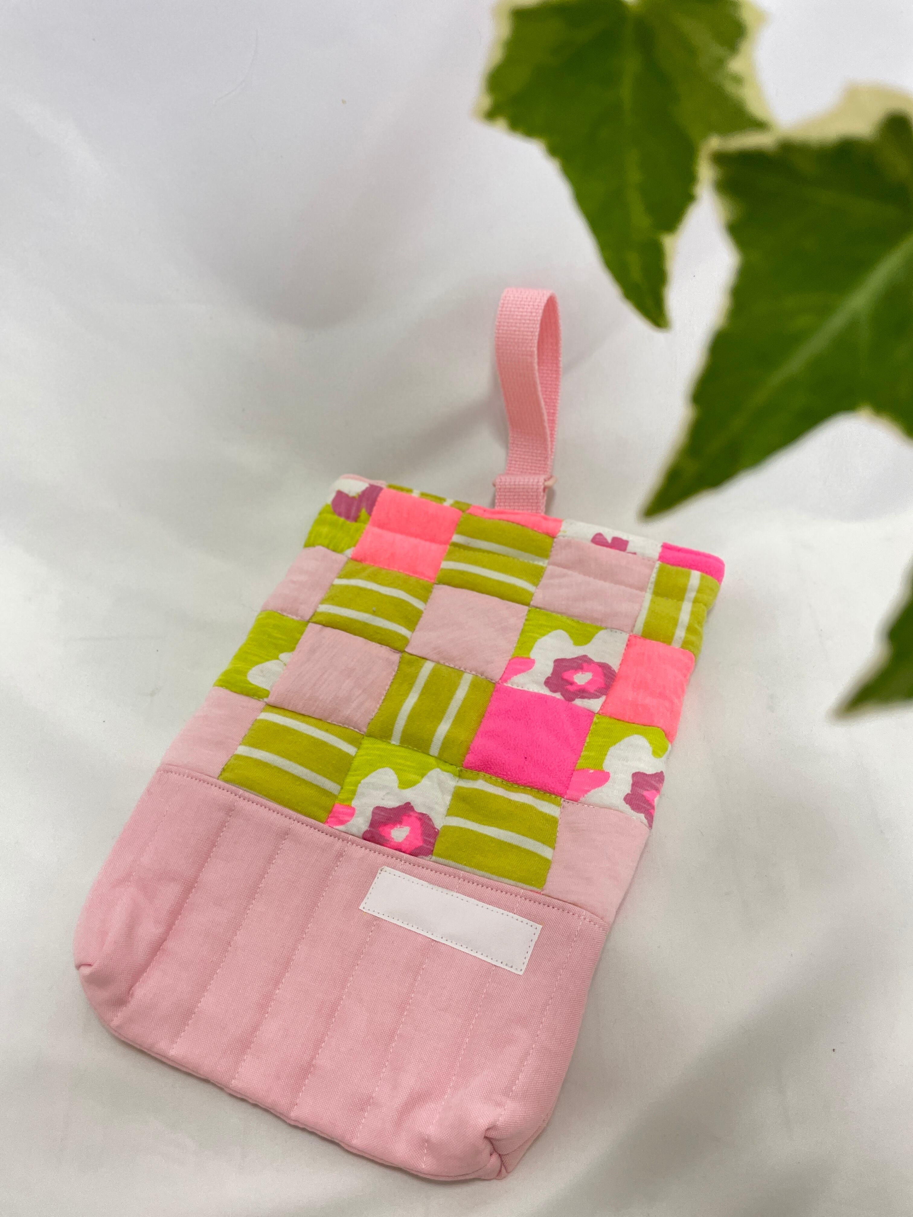 ピンクと優しいうぐいす色が織り成す独特な柄が目を引く一品です。個々のパッチがさまざまな色や柄を持ち、まるで物語のようなデザインです。バッグを持つだけで、見ているだけでワクワク感を味わえます。