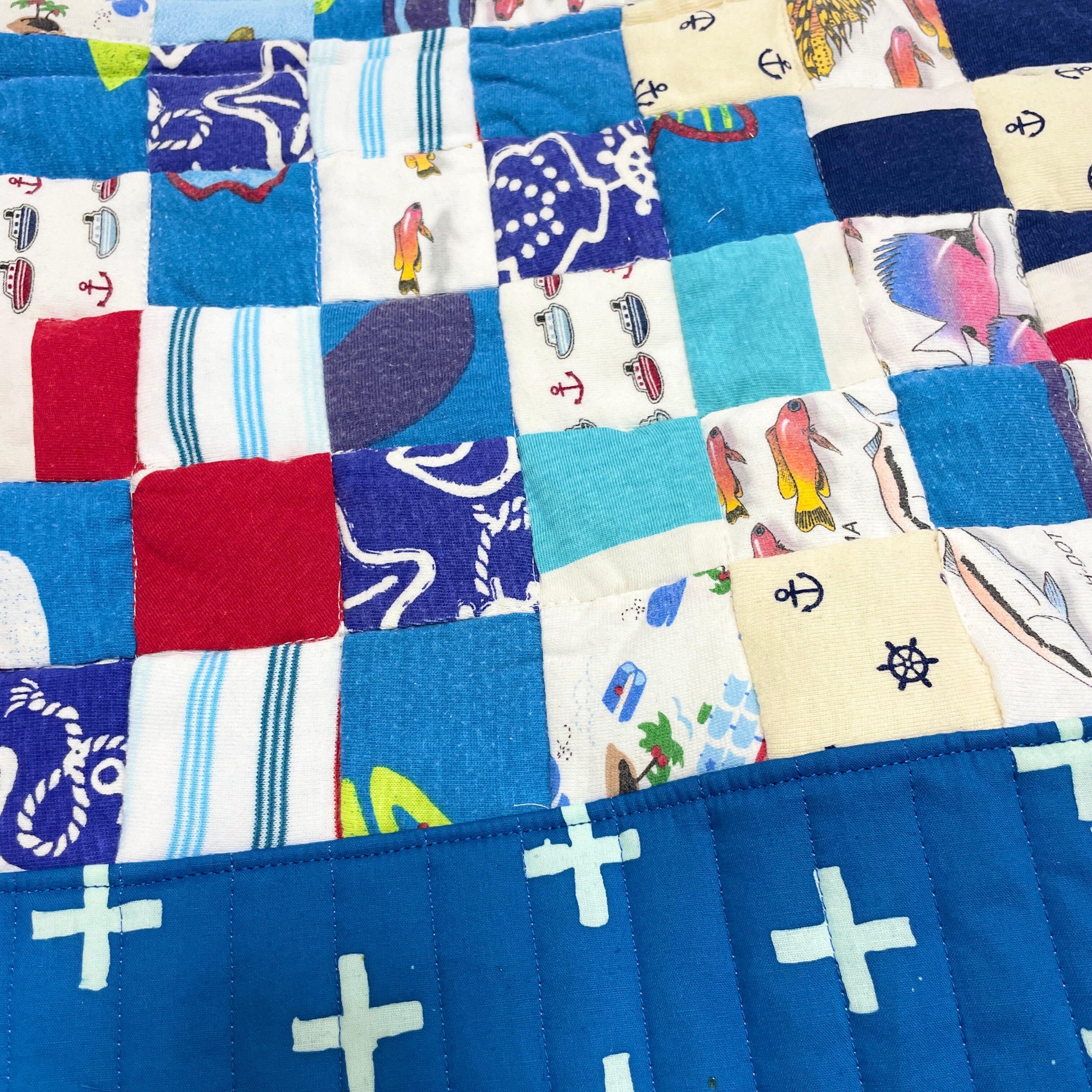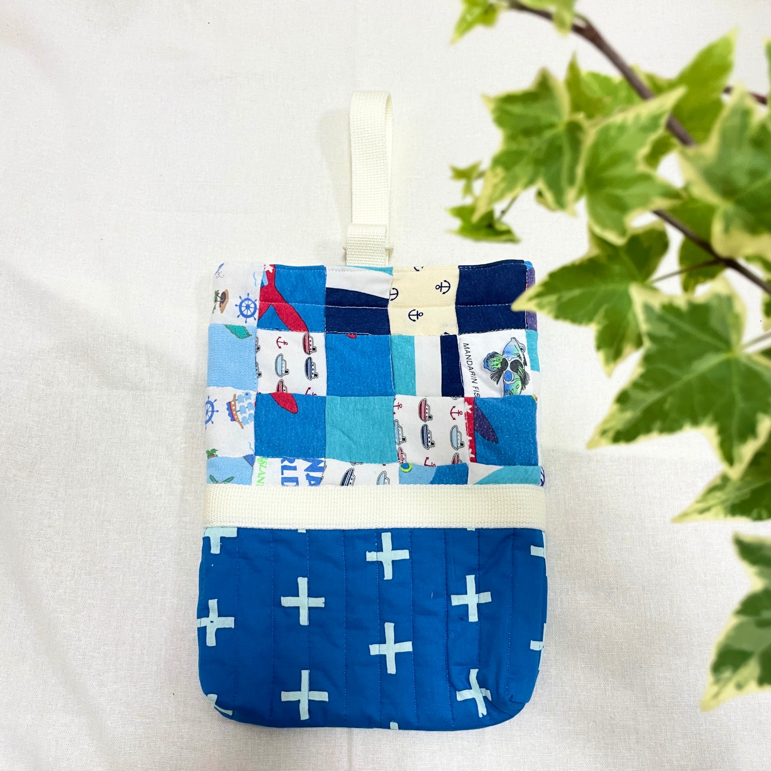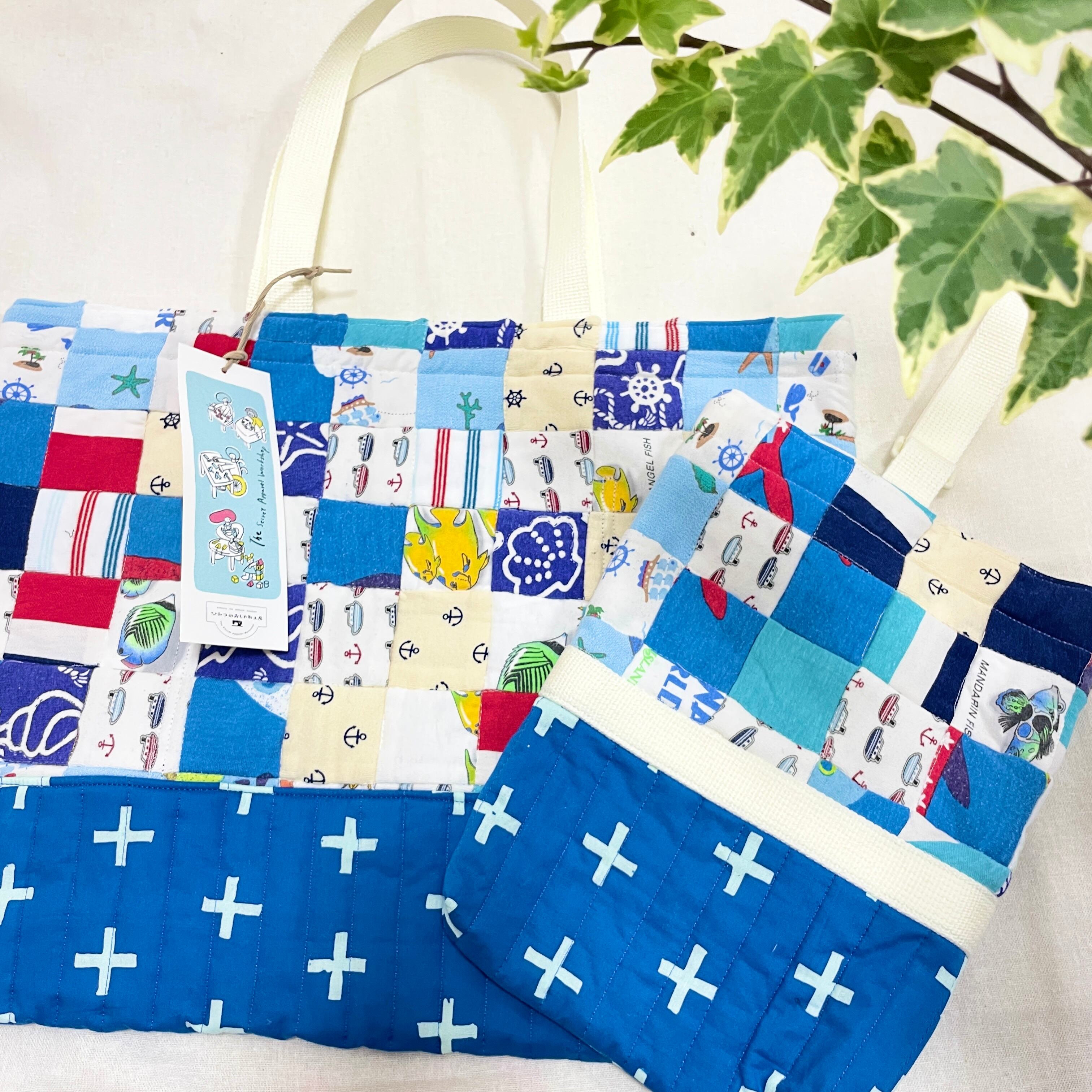 リメイクパッチワーク【ブルー系】レッスンバッグ&シューズバッグは、オーシャンブルーと白をベースに、船や海のシルエットがデザインされた男の子向けの爽やかなバッグです。
