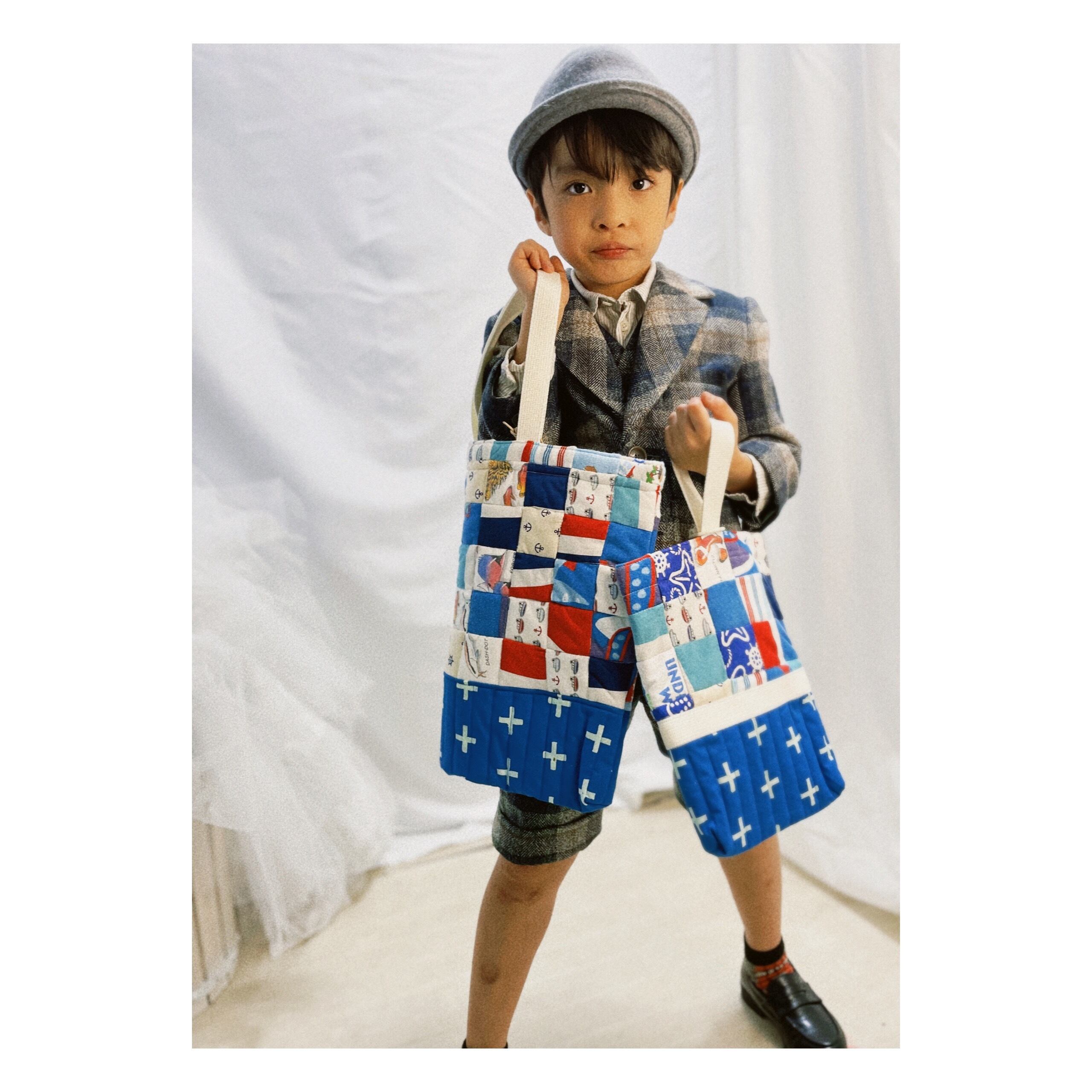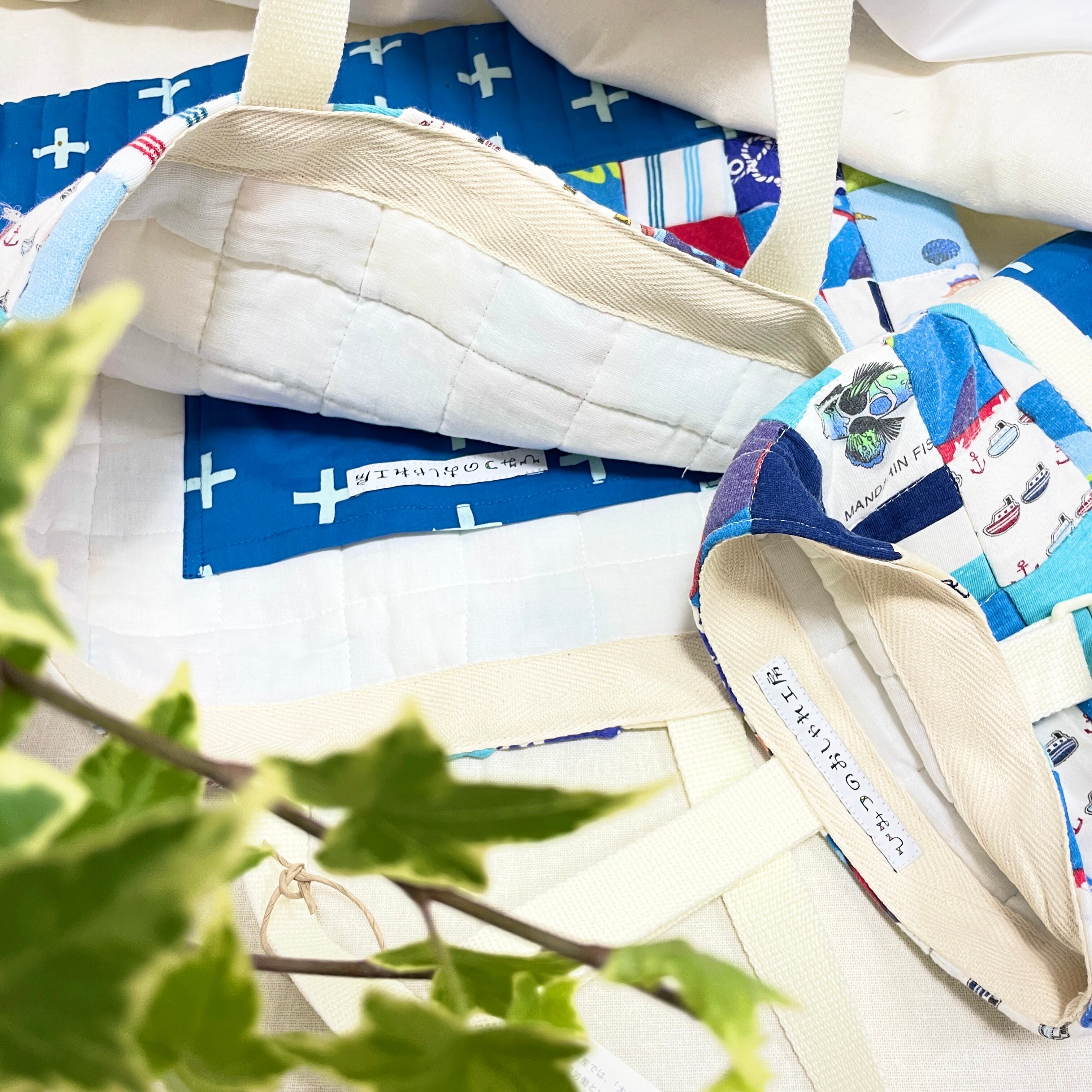 裏面及びパッチワーク以外の部分はキルティングです。このバッグは再利用された布地を使用しており、世界に一点しかない個性的なアイテムです。環境に優しく、何度もの洗濯や使用でも長く愛用していただけますように、丁寧に作られています。